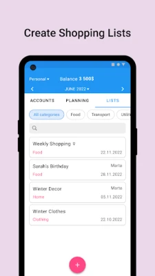 - Unlimited Accounts - Shared budgets with unlimited users - Simple and clear statistics and transaction history - Unlimited Categories - Shared shopping lists with other users - Personal and shared workspaces