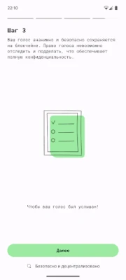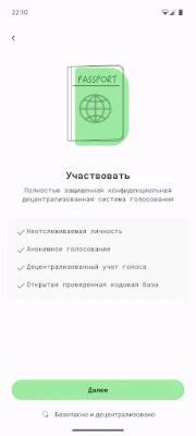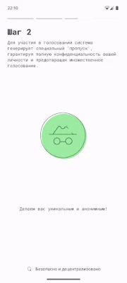 При регистрации на голосование система генерирует специальный 'пропуск', который позволяет пользователю отправить свой голос. Этот пропуск не связан с персональными данными пользователя, обеспечивая анонимность голоса. Ваш голос будет зафиксирован анонимно и зарегистрирован в публичной, децентрализованной учетной системе, основанной на технологии блокчейна. По завершении голосования результаты становятся доступны в сети для всех участников, обеспечивая невозможность изменения или манипуляции результатами со стороны любых третьих лиц.